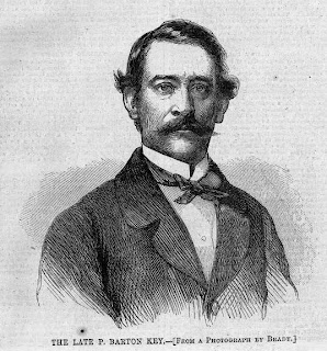 Phillip (above) was forty-two year old widower at the time, with six children, and “the handsomest man in all Washington society”, according to Mrs. Clemet Clay, the biggest gossip in a town that still lives on gossip. At six feet tall, Phillip had “sad eyes and a languid charm” (according to Edward Pinchon who wrote a bio of Dan Sickles), and his “…fine figure, fashionable air, and agreeable address, rendered him extremely popular among the gentler sex”, according to Felix G. Fontaine, who wrote “The Washington Tragedy”. Key was also the Federal District Attorney for Washington, and thus a good man to know for anyone who might anticipate developing legal problems. Daniel had so far made a second career out of his legal problems, so he decided that Phillip Key was the perfect man to escort Terresa to Washington social functions while Daniel was “relaxing” in Baltimore with Fanny White, and others.