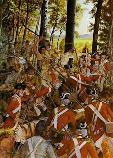 He lost, of course - the cards were stacked, the game was rigged and he wasn't a lawyer. So, out of the mostly illiterate seetlers who had been duped by Wentworth, Allen formed “The Green Mountain Boys”, and began a campaign of terror against their opponents - for example, in October of 1771, when local farmer Benjamin Hough was appointed a justice of the peace for New York, his farm was burned and Ethen delivered 200 lashes across Hough's bare back, before banishing him from the country. Such treatment became standard for The Boys (above). The New York colonial government tried to reason with the “Bernnington mob”, and finally in 1774 passed the Act of Outlawry, which ordered Ethan Allen and seven other Boys to turn themselves in or be be hanged without a trial. It also put a price of 100 pounds on Ethan Allen's head. Whereupon “The Boys” offered ten pounds for the arrest of the Governor of New York. By the spring of 1775 New York was ready to call out their milita. Then in Massachuets some fool fired a musket on Lexington Green, and New York had something more pressing on its mind; revolution.