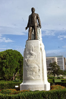 bronze version of the King Fish, gazing upon his building.