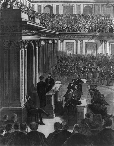 After the war it was Schuyler Colfax who oversaw passage of the Thirteen Amendment, abolishing slavery in the United States. Later he led the forces that impeached Lincoln's reluctant successor, President Andrew Johnson. The impeachment trial failed in the Senate by one vote. But two years later, Schuyler used that half victory to maneuver against 11 other candidates to win the nomination for Vice President, on the 11th ballot alongside Presidential nominee Ulysses Simpson Grant. However that nasty victory left Schulyer with new enemies, and ensured that Grant would never trust him. Still Schuyler made history, because with his election that November he became the youngest Vice President in history, and also the first man to have presided over both the House of Representatives and the Senate. (In 1932 Texan John Nance Garner became the second.)