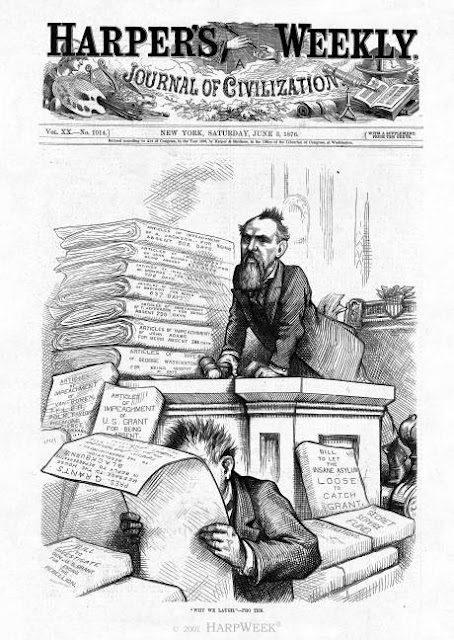When asked about stock dividends he had received from Mobilier, Schuyler (above, center, in his Odd Fellows robes) insisted “I am an honest man...I never took anything that wasn't given to me.” It was probably the dumbest thing he ever said, so dumb, he may have never said it, but also so accurate, it stuck. Shortly there after Grant privately urged his Vice-President to resign. Grant insisted he wanted to appoint Schuyler as Secretary of State . “In all my heart I hope you will say yes,” wrote Grant. But Schuyler knew that as Veep he could only be removed by a messy impeachment trial, while cabinet members could be simply fired, and he refused the offer.