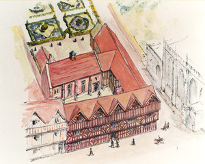 Perhaps the flies explain why a good Catholic boy like William left Stratford, abandoning his wife and children, to pursue a career then viewed as sinful – in the theater. Against all odds he became a success, so well paid on the London stage that in 1597 he was able to pay sixty pounds for a 17 acre estate at the corner of Stratford and Chapel streets, in the middle of Stratford. It had two gardens, two small orchards, two barns and outbuildings, and the second largest house in Stratford, a two story Tudor stucco and beam affair, with a brick foundation - even the cesspit was brick. Though it was already a hundred years old, it was still called called “New Place”, and William deposited his wife and two daughters here, while he returned to London.