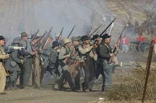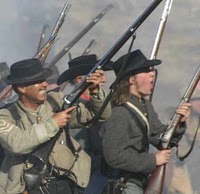 But on Logan's right flank, what follows would be a comedy of errors if men were not being killed and maimed. The 23rd Indiana regiment crosses Fourteen Mile Creek above the bridge, and stumbles sideways into a Texas Regiment that punishes the Hoosiers with fire and sends their survivors scampering back the way they came. Then the Texans charge across the creek and are caught in a cross fire between an Ohio and an Illinois regiments. In their turn the Texans fall back in retreat.