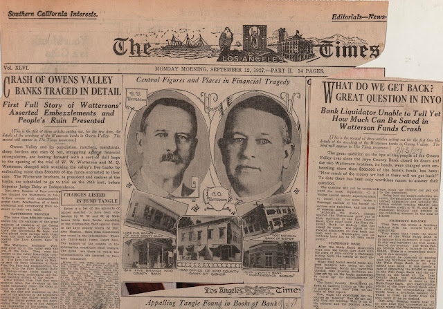 Besides holding extensive banking (above), business and mining interests across the Owens Valley, the Wattersons headed the Owens Valley Irrigation District, which sought to organize landowners in a united front against Mulholland and the D.W.P. Still, slowly, the D.W.P. kept wearing the farmers down until, one after another, they were forced to sell out..