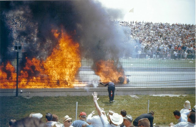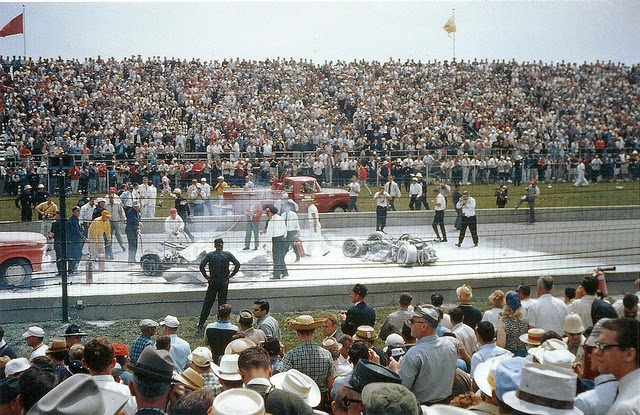 Since none of the drivers or mechanics were restrained in any way, Greiner flew out of the cockpit “like a shucked oyster”, taking the steering wheel with him. He claimed later, “I was perfectly conscious when we whirled through the air,” except he was the only one flying. According to the Indianapolis News, Greiner landed 25 feet away, with a fractured skull and a broken arm. Mechanic Sam Dickson (above) stayed in the car, uninjured...until, after teetering for a second or two, the car fell forward, driving Sam into the ground head first, “like a tent peg”. He died instantly