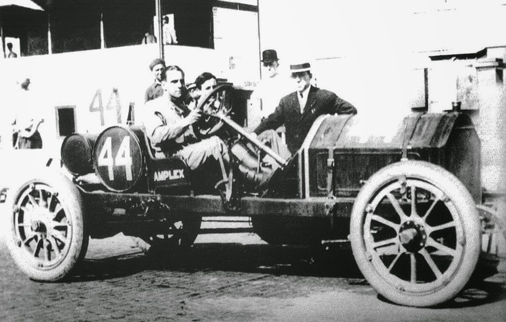 There was also a pair of “Interstate” cars, manufactured in Muncie, a pair of smoke emitting 2 stroke “Amplex” cars from Mishawaka, Indiana, and a Westcott car built in Richmond, Indiana. Detroit sent 2 “Buick” racers - one driven by Arthur Chevrolet – and 2 cars from Harry “Loizer”'s new factory. Columbus, Ohio provided a “Firestone”, driven by Eddie Rickenbacker. Germany backed a “Benz” team and a “Mercedes” team.