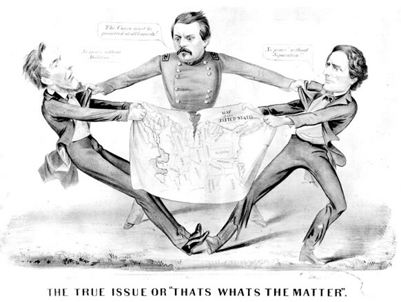 Marble now became the publicist for the Democratic Party, and its champion, General McClellan (above, center). He spent the next six months retelling and even creating every lie conceivable about Lincoln, charging him with wanting to force race mixing on the public, and ignoring the pain and sacrifices of Union soldiers on the battlefield.