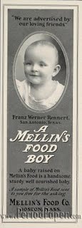 It was an Atlanta pharmacist, Dr. John Pemberton, who cooked up Coke-a-Cola in his back yard in 1886. And Caleb Bradham of New Bern, North Carolina invented Pepsi Cola in his pharmacy during the summer of 1893. In Cincinnati in 1886 Robert Johnson, who had worked as a pharmacists’ apprentice, joined with his brothers James and Mead in forming Johnson and Johnson, to sell their inventions of band aids and first aid kits. But the guiding light for Gustave Mellin was Henri Nestle, a Swiss citizen who in 1867, made his reputation and his fortune by saving a premature infant with a recipe of powdered milk and ground up wheat. Nestle's formula released the proteins trapped in wheat by grinding it into a powder, and thus making them easier for the baby to digest. And, though Nestle and Mellin did not realize it yet, this also made it possible to transport the wheat proteins over vast distances and store them for long periods.