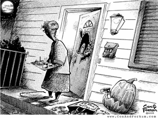 And that is where all smart adults should be on Monday night, dreading the sound that fills the night with horror and chills the bones; “Trick or treat, trick or treat, give us something good to eat. Or else.”  Yes, Trick or Treat, and bon appetit, my fellow cowering masses. And if you survive this night, you have just two years until the next horror ; election day 2018!  Boo Who? Boo You, that's who!