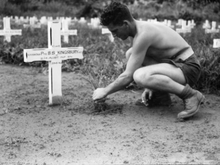 Bruce’s citation for the Victoria Cross says that he “…rushed forward firing his Bren Gun from the hip through terrific machine gun fire and succeeded in clearing a path through the enemy…(Then he) was seen to fall to the ground shot dead, by the bullet from a sniper hiding in the wood….Private Kingsbury displayed a complete disregard for his own safety. His initiative and superb courage made possible the recapture of the position which undoubtedly saved the Battalion Headquarters…” Allen Avery charged into the jungle after the sniper, but never found him. Then he hefted Bruce up onto his back and alone Allen carried Bruce to an aid post. But by the time they got there, Bruce was dead.
