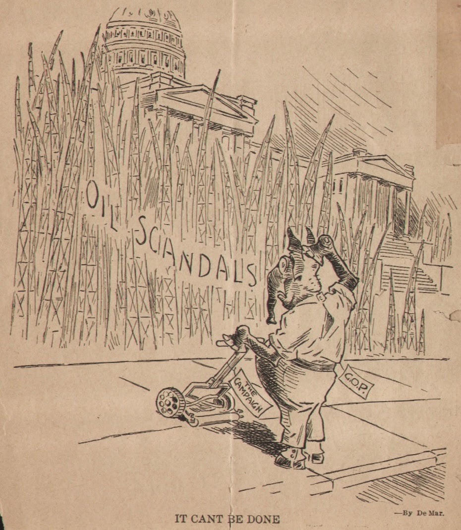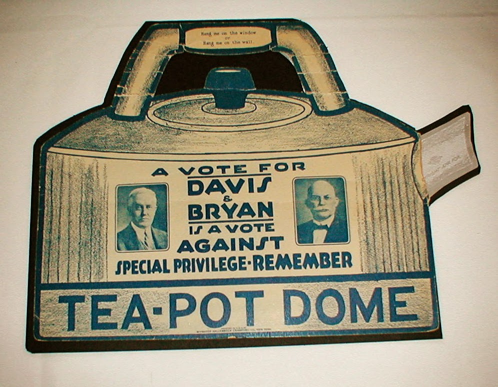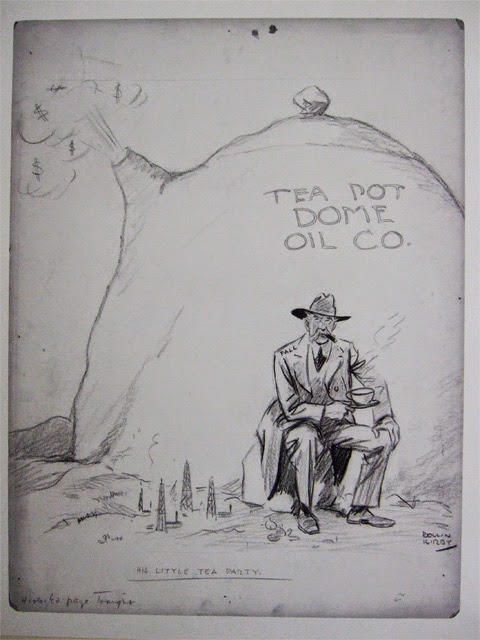 Harding wanted Albert Fall to be his Secretary of State, but party leaders insisted on someone more trustworthy. Said Harding, “If Albert Fall isn't an honest man, I'm not fit to be President of the United States.” When the party leaders refused to back down Harding named Albert his Secretary of the Department of the Interior, a branch of government Albert had been denouncing for decades. Almost the first thing after taking the oath in the spring of 1921 (above), Secretary Fall cajoled Harding into giving Interior control over the U.S. Naval Oil Reserves in California and Wyoming. Fall then quickly granted a no-bid lease for the two reserves in California to oilman Edward Doheny, and in December Albert did the same for oilman Harry Ford Sinclair, granting him sole access to the Tea Pot Dome field, also known as Naval Reserve Number Three.