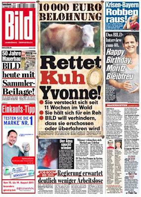 But Yvonne had udder ideas. She must have sensed that what had been done to her was done soley for the convienence of humans. And she thought she was not well done. Yvonne was a rare German burger, indeed. She was still drawn to humans, as proven by a local grand-moo-ther who spotted cow paddies in her backyard. A veterinarian who examined the fee-cow matter, dubbed Yvonne to be healthy. The magazine Bild now offered ten thousand euros for a peaceful end to the Great Escape.